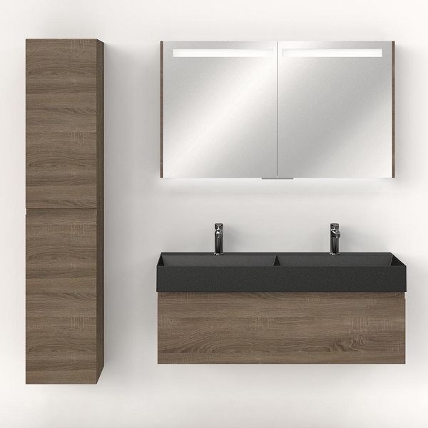 Greeploos badkamermeubel in de kleur eiken donker is 120 cm breed. De wastafel is vervaardig in keramiek en heeft de kleur antraciet mat keramiek. Dit badkamermeubel met deze wastafel is leverbaar tussen de 60 cm t/m 160 cm