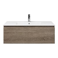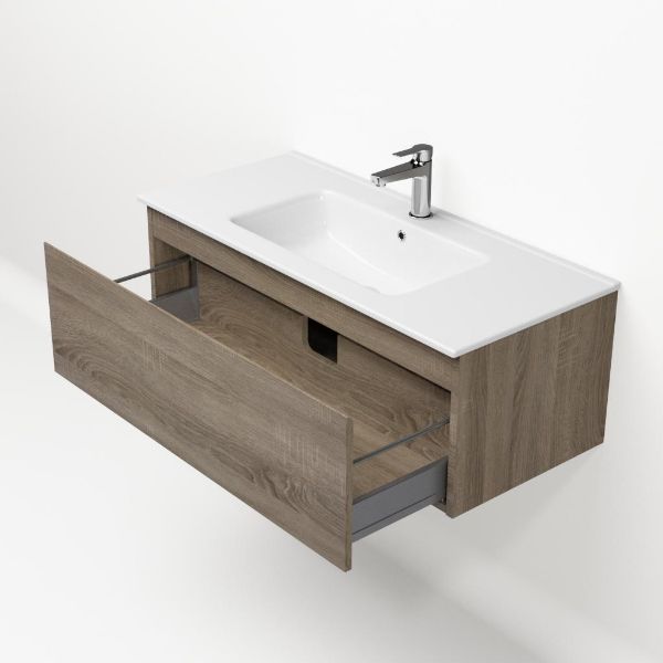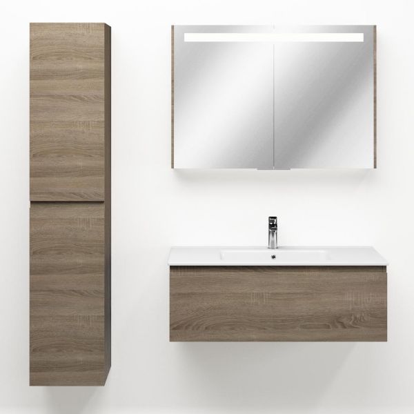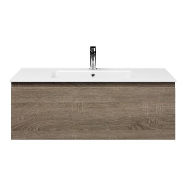 Greeploos badkamermeubel in de kleur eiken donker is 100 cm breed. De wastafel is vervaardig in keramiek en heeft de kleur wit keramiek. Dit badkamermeubel met deze wastafel is leverbaar tussen de 60 cm t/m 120 cm