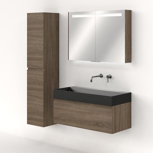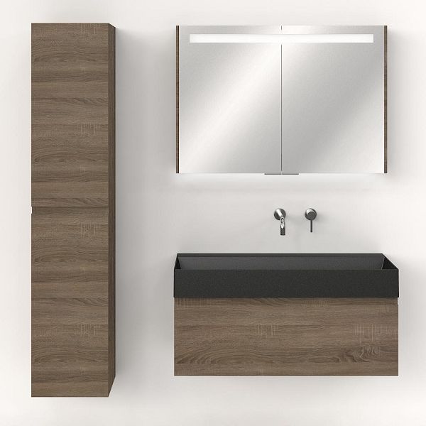 Greeploos badkamermeubel in de kleur eiken donker is 100 cm breed. De wastafel is vervaardig in keramiek en heeft de kleur antraciet mat keramiek. Dit badkamermeubel met deze wastafel is leverbaar tussen de 60 cm t/m 160 cm