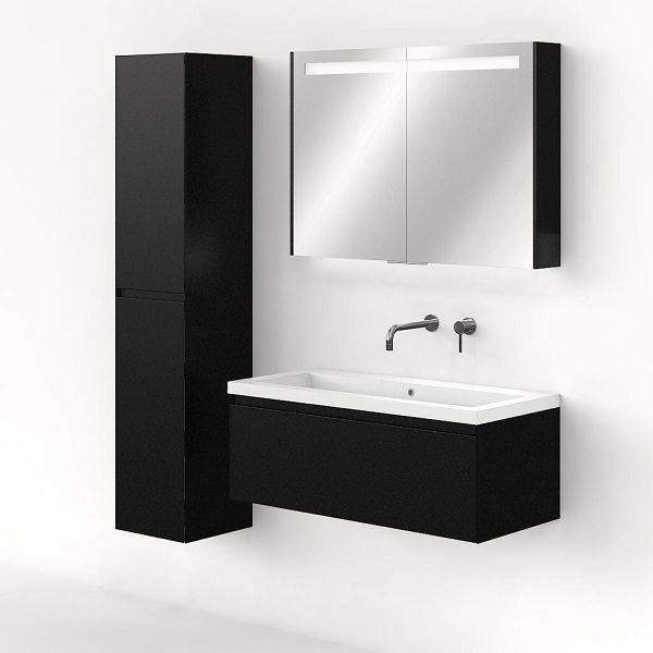 Greeploos badkamermeubel in de kleur zwart mat is 100 cm breed. De wastafel is vervaardig in polystone en heeft de kleur wit. Dit badkamermeubel met deze wastafel is leverbaar tussen de 60 cm t/m 160 cm