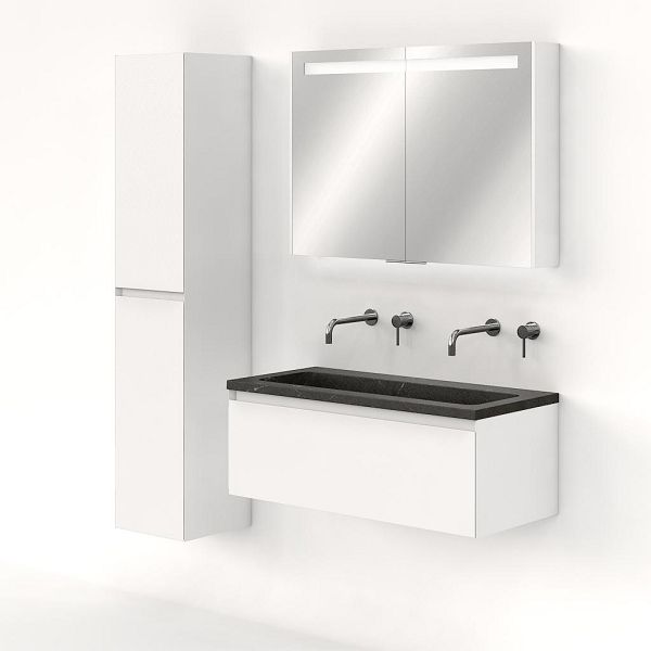 Greeploos badkamermeubel in de kleur wit mat is 100 cm breed. De wastafel is vervaardig in natuursteen en heeft de kleur blue stone. Dit badkamermeubel met deze wastafel is leverbaar tussen de 60 cm t/m 120 cm