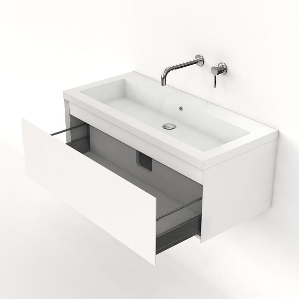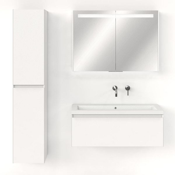 Greeploos badkamermeubel in de kleur wit mat is 100 cm breed. De wastafel is vervaardig in polystone en heeft de kleur wit. Dit badkamermeubel met deze wastafel is leverbaar tussen de 60 cm t/m 160 cm