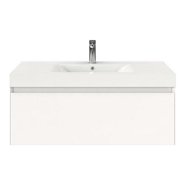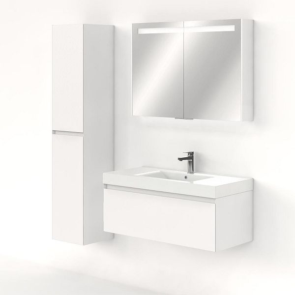 Greeploos badkamermeubel in de kleur wit mat is 100 cm breed. De wastafel is vervaardig in polystone en heeft de kleur wit. Dit badkamermeubel met deze wastafel is leverbaar tussen de 60 cm t/m 120 cm
