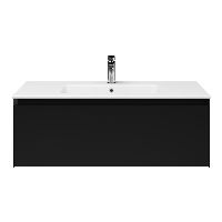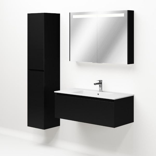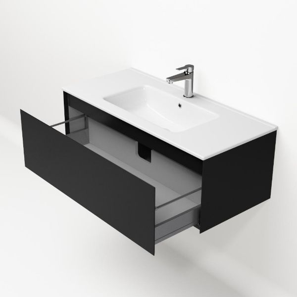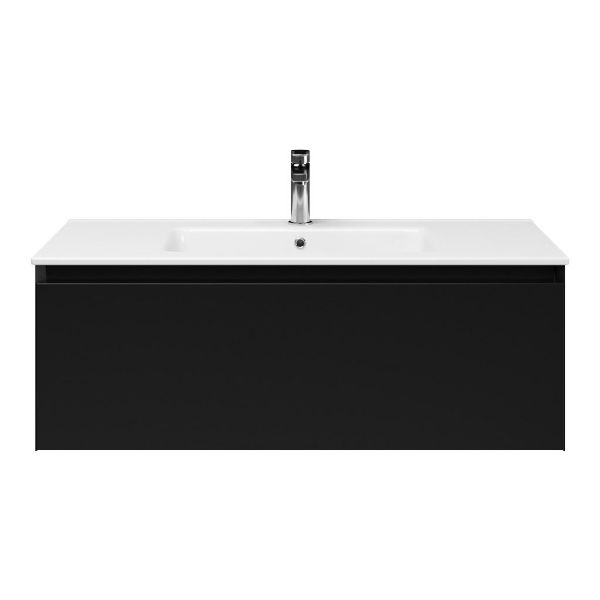 Greeploos badkamermeubel in de kleur zwart mat is 100 cm breed. De wastafel is vervaardig in keramiek en heeft de kleur wit keramiek. Dit badkamermeubel met deze wastafel is leverbaar tussen de 60 cm t/m 120 cm