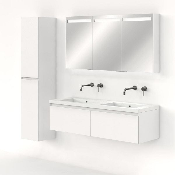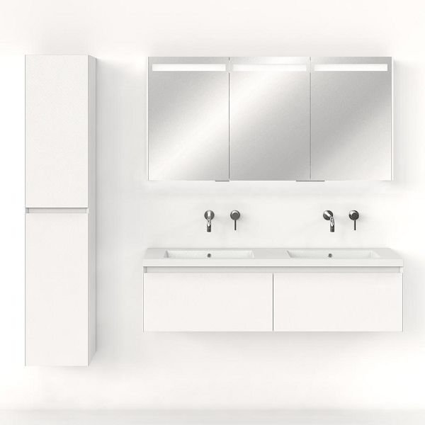 Greeploos badkamermeubel in de kleur wit mat is 140 cm breed. De wastafel is vervaardig in polystone en heeft de kleur wit. Dit badkamermeubel met deze wastafel is leverbaar tussen de 60 cm t/m 160 cm