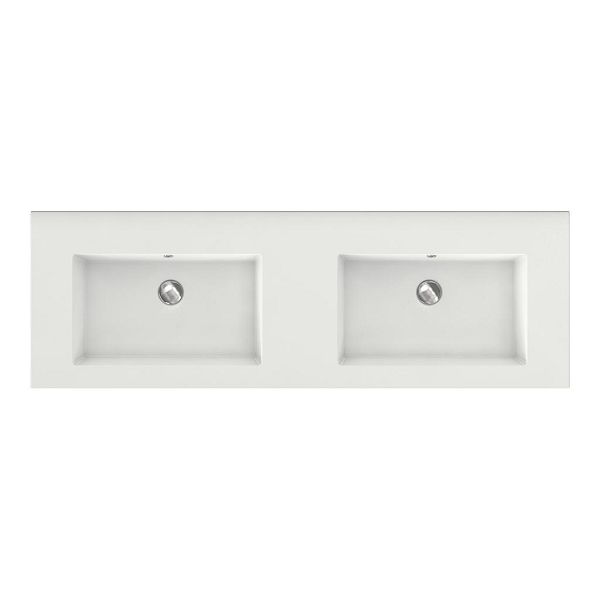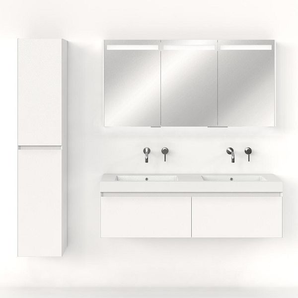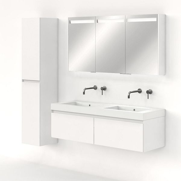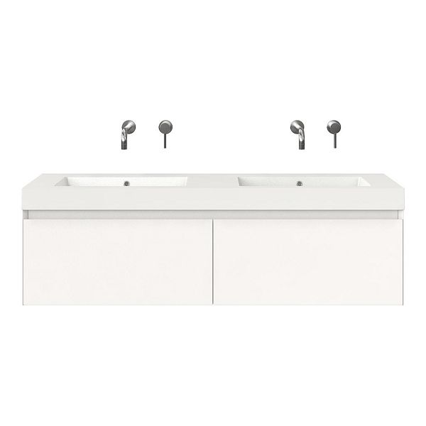 Greeploos badkamermeubel in de kleur wit mat is 140 cm breed.  De wastafel is vervaardig in polystone en heeft de kleur wit. Dit badkamermeubel met deze wastafel is leverbaar tussen de 60 cm t/m 160 cm