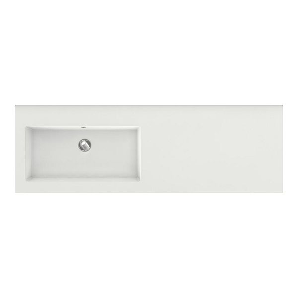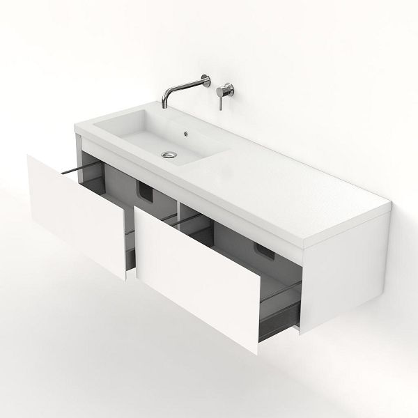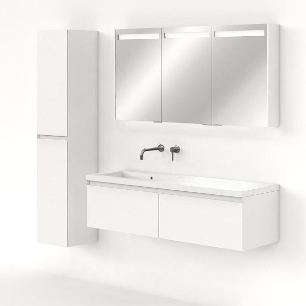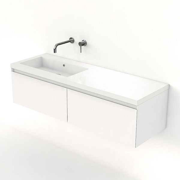 Greeploos badkamermeubel in de kleur wit mat is 140 cm breed.  De wastafel is vervaardig in polystone en heeft de kleur wit. Dit badkamermeubel met deze wastafel is leverbaar tussen de 60 cm t/m 160 cm