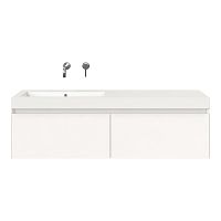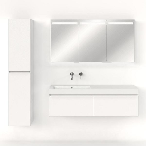 Greeploos badkamermeubel in de kleur wit mat is 140 cm breed.  De wastafel is vervaardig in polystone en heeft de kleur wit. Dit badkamermeubel met deze wastafel is leverbaar tussen de 60 cm t/m 160 cm