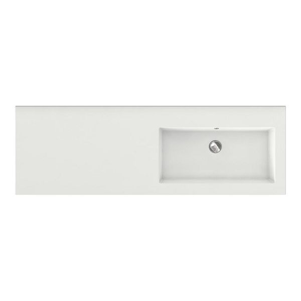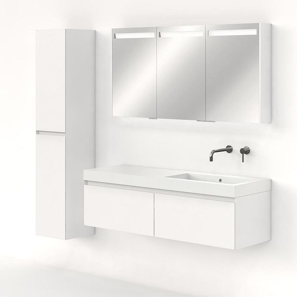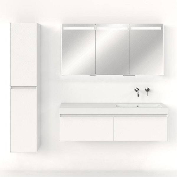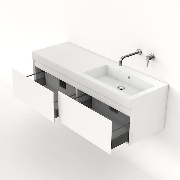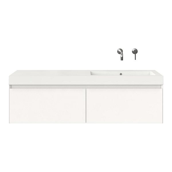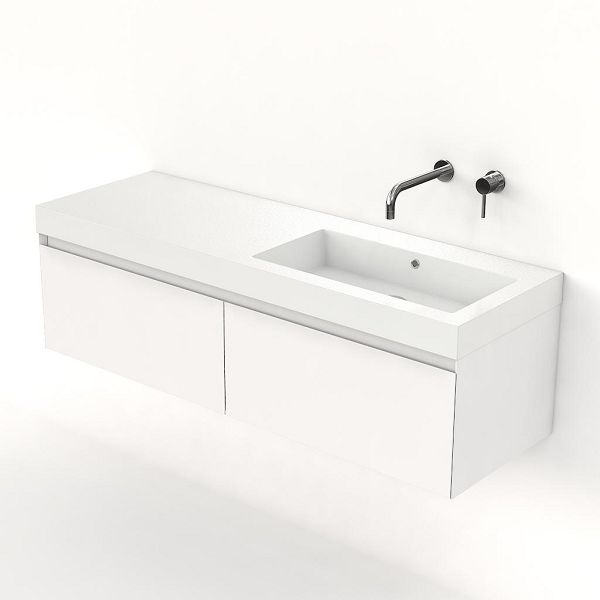 Greeploos badkamermeubel in de kleur wit mat is 140 cm breed. De wastafel is vervaardig in polystone en heeft de kleur wit. Dit badkamermeubel met deze wastafel is leverbaar tussen de 60 cm t/m 160 cm