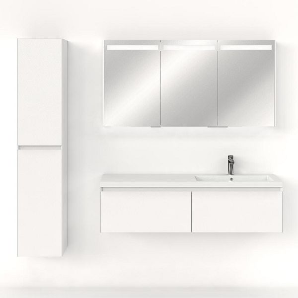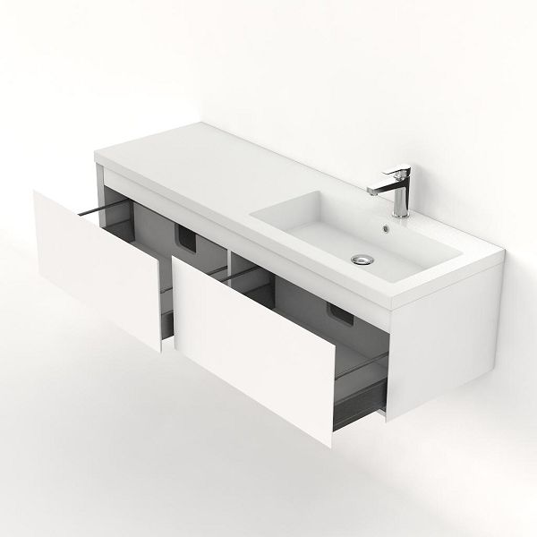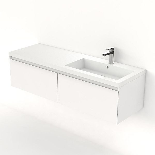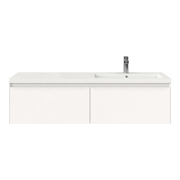 Greeploos badkamermeubel in de kleur wit mat is 140 cm breed. De wastafel is vervaardig in polystone en heeft de kleur wit. Dit badkamermeubel met deze wastafel is leverbaar tussen de 60 cm t/m 160 cm