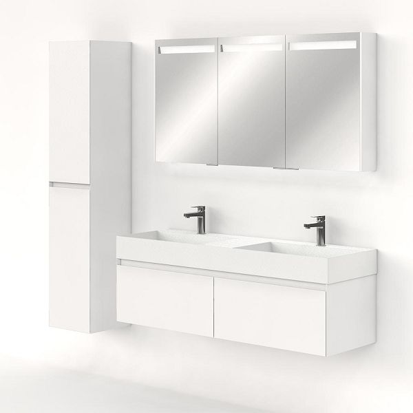 Greeploos badkamermeubel in de kleur wit mat is 140 cm breed. De wastafel is vervaardig in keramiek en heeft de kleur wit mat keramiek. Dit badkamermeubel met deze wastafel is leverbaar tussen de 60 cm t/m 160 cm