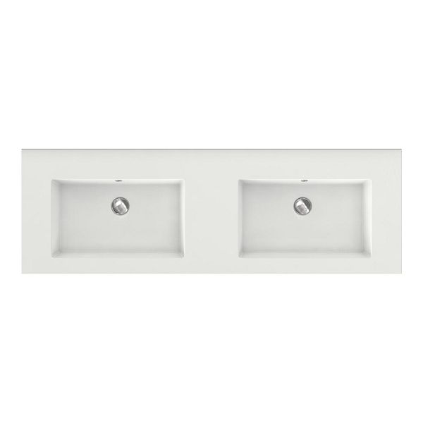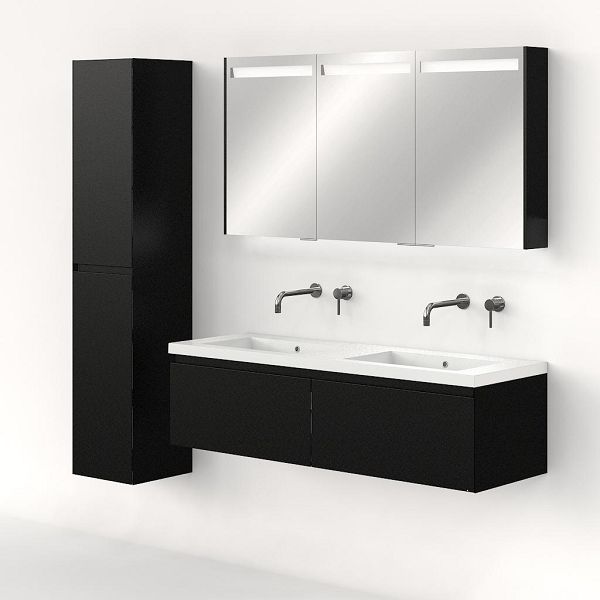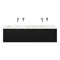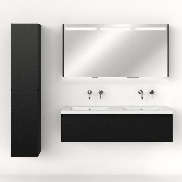 Greeploos badkamermeubel in de kleur zwart mat is 140 cm breed. De wastafel is vervaardig in polystone en heeft de kleur wit. Dit badkamermeubel met deze wastafel is leverbaar tussen de 60 cm t/m 160 cm