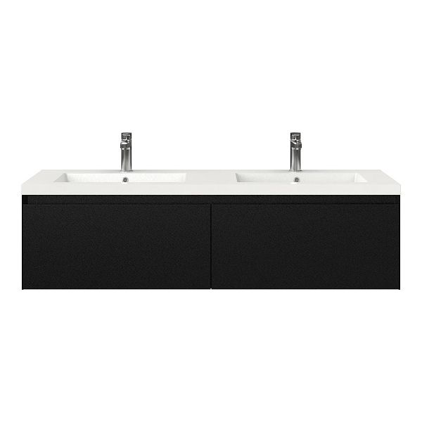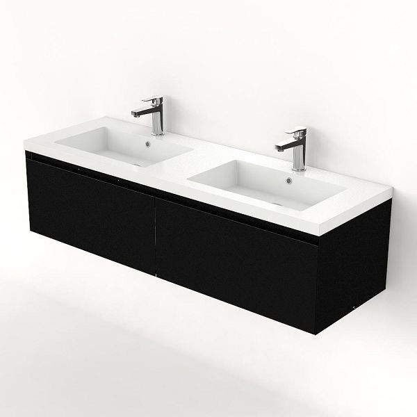 Greeploos badkamermeubel in de kleur zwart mat is 140 cm breed.  De wastafel is vervaardig in polystone en heeft de kleur wit. Dit badkamermeubel met deze wastafel is leverbaar tussen de 60 cm t/m 160 cm