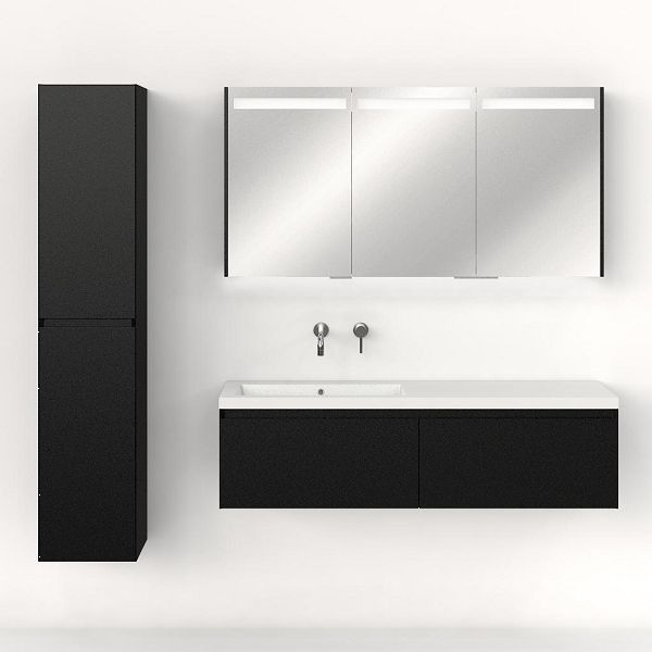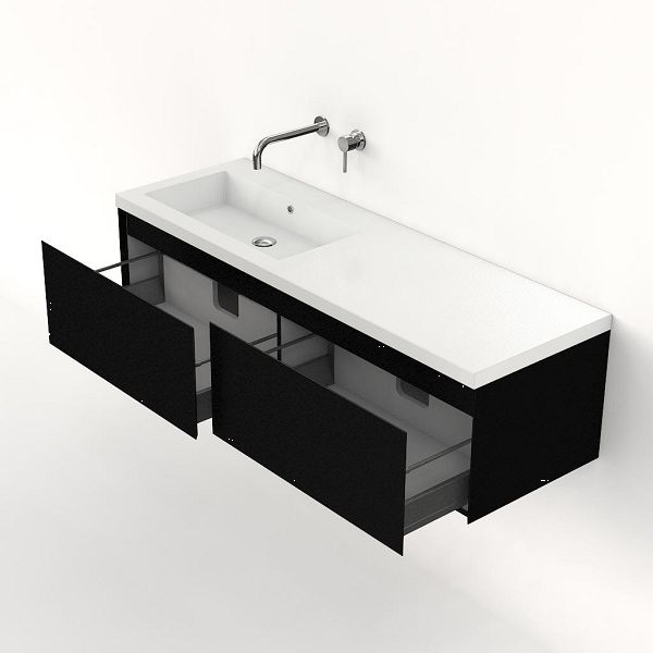 Greeploos badkamermeubel in de kleur zwart mat is 140 cm breed. De wastafel is vervaardig in polystone en heeft de kleur wit. Dit badkamermeubel met deze wastafel is leverbaar tussen de 60 cm t/m 160 cm