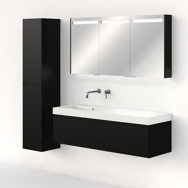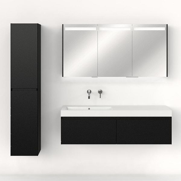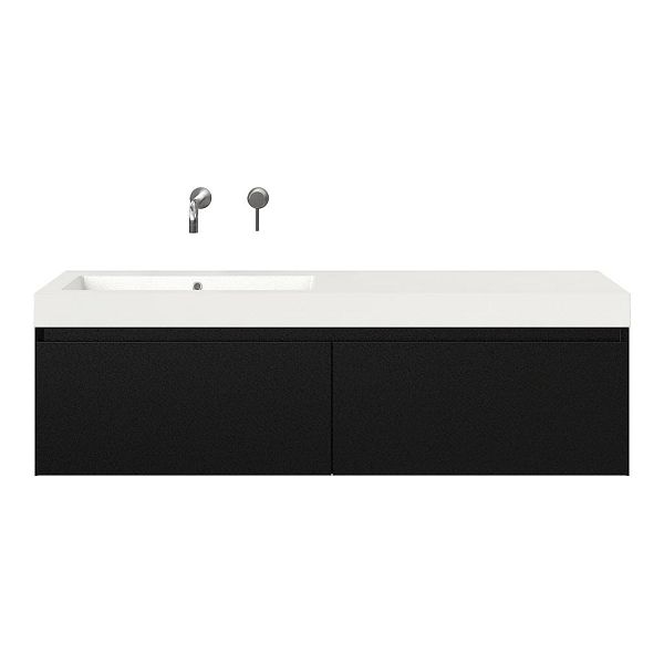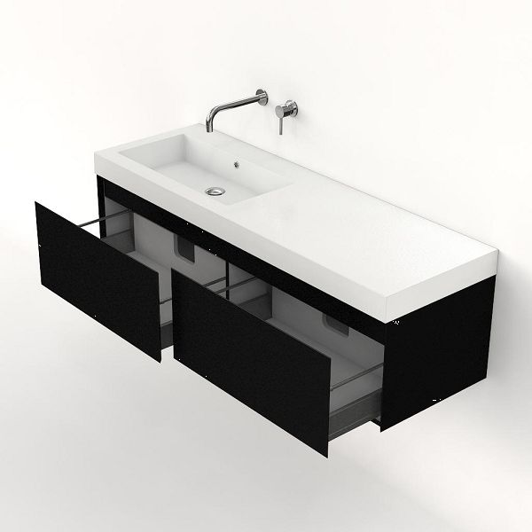 Greeploos badkamermeubel in de kleur zwart mat is 140 cm breed.  De wastafel is vervaardig in polystone en heeft de kleur wit. Dit badkamermeubel met deze wastafel is leverbaar tussen de 60 cm t/m 160 cm