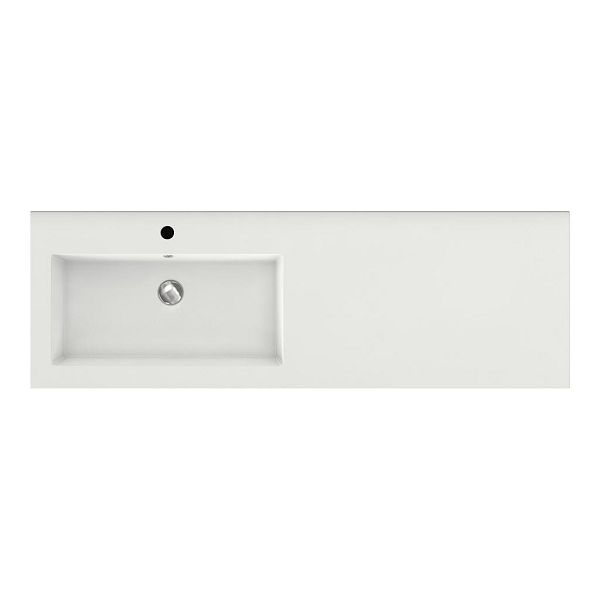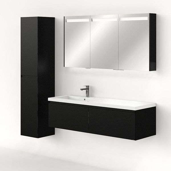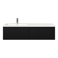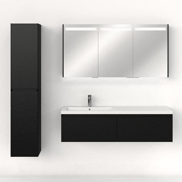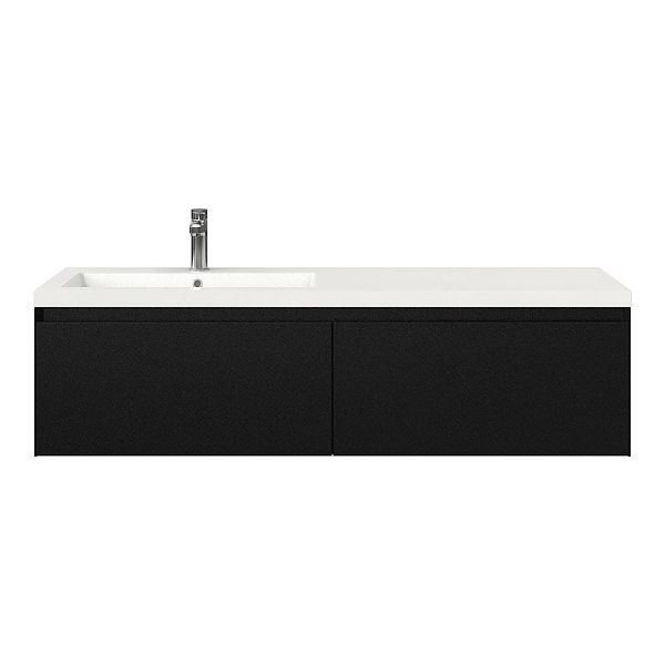 Greeploos badkamermeubel in de kleur zwart mat is 140 cm breed. De wastafel is vervaardig in polystone en heeft de kleur wit. Dit badkamermeubel met deze wastafel is leverbaar tussen de 60 cm t/m 160 cm