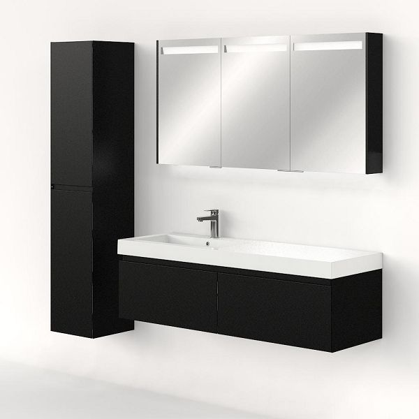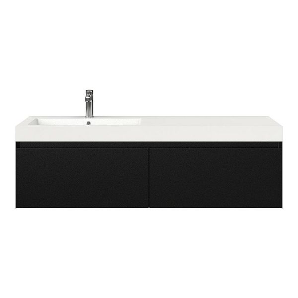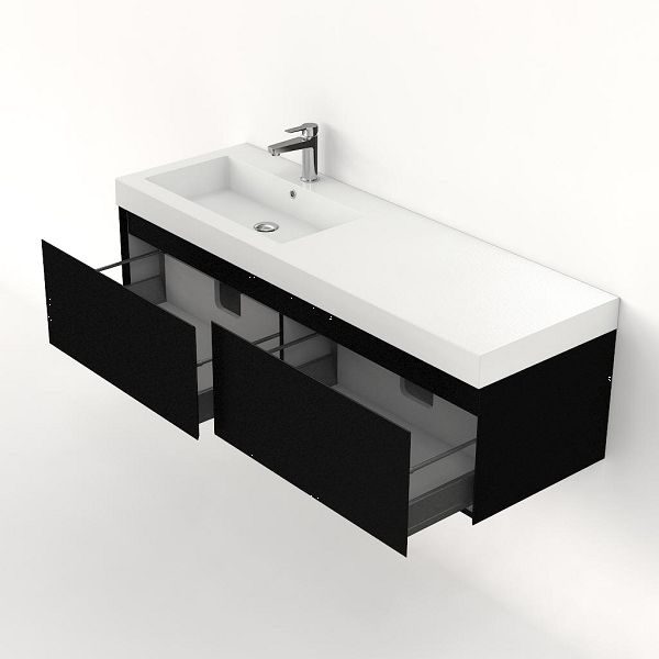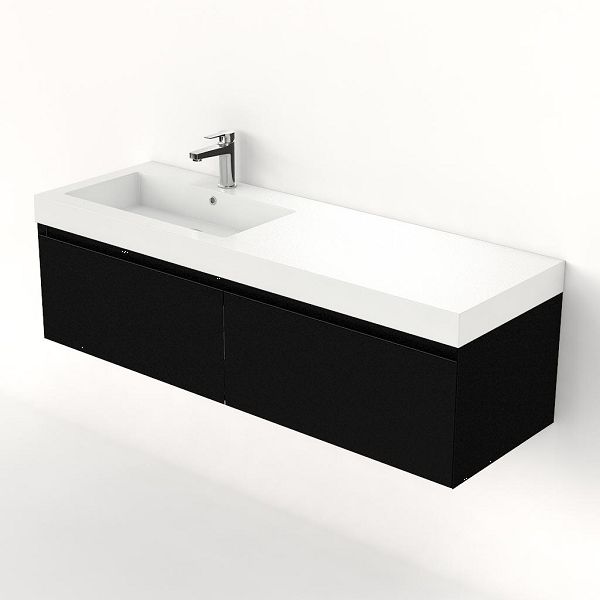 Greeploos badkamermeubel in de kleur zwart mat is 140 cm breed.  De wastafel is vervaardig in polystone en heeft de kleur wit. Dit badkamermeubel met deze wastafel is leverbaar tussen de 60 cm t/m 160 cm