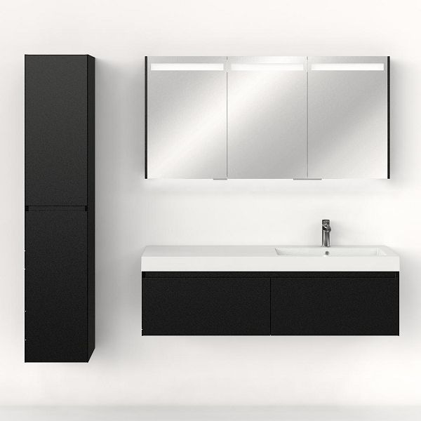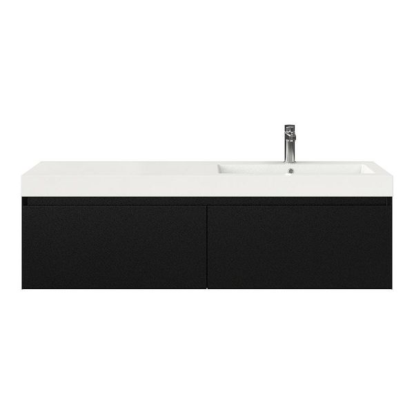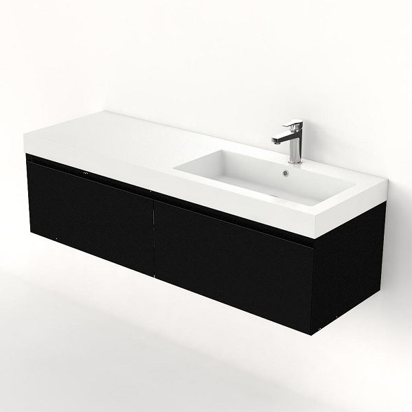 Greeploos badkamermeubel in de kleur zwart mat is 140 cm breed.  De wastafel is vervaardig in polystone en heeft de kleur wit. Dit badkamermeubel met deze wastafel is leverbaar tussen de 60 cm t/m 160 cm