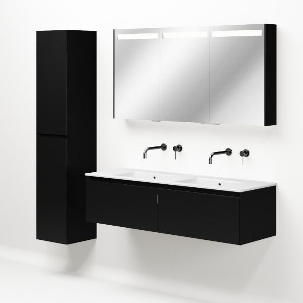 Greeploos badkamermeubel in de kleur zwart mat is 140 cm breed. De wastafel is vervaardig in keramiek en heeft de kleur wit keramiek. Dit badkamermeubel met deze wastafel is leverbaar tussen de 60 cm t/m 120 cm
