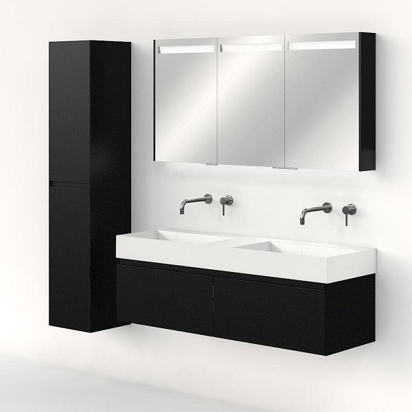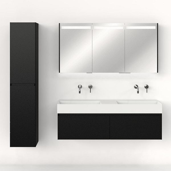 Greeploos badkamermeubel in de kleur zwart mat is 140 cm breed. De wastafel is vervaardig in keramiek en heeft de kleur wit keramiek. Dit badkamermeubel met deze wastafel is leverbaar tussen de 60 cm t/m 160 cm