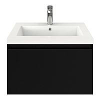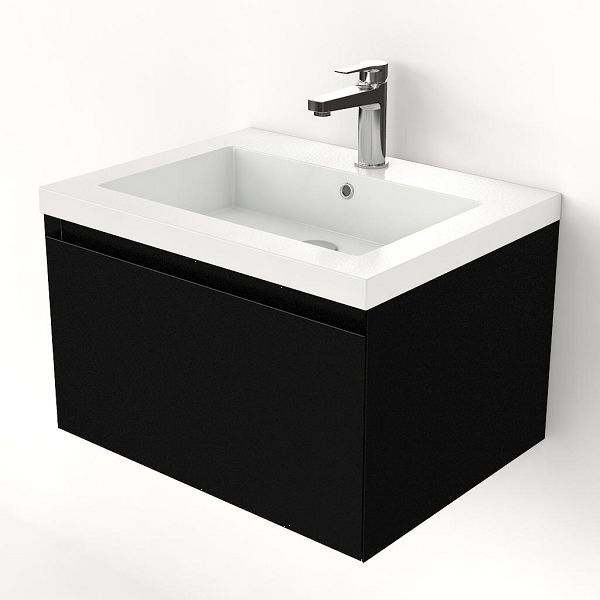 Greeploos badkamermeubel in de kleur zwart mat is 60 cm breed.  De wastafel is vervaardig in polystone en heeft de kleur wit. Dit badkamermeubel met deze wastafel is leverbaar tussen de 60 cm t/m 160 cm