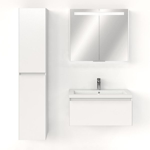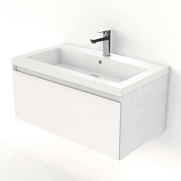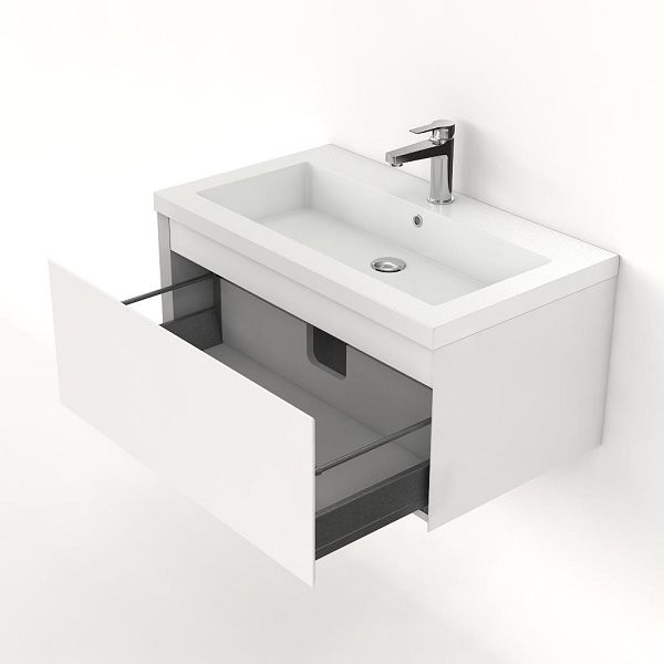 Greeploos badkamermeubel in de kleur wit hoogglans is 80 cm breed.  De wastafel is vervaardig in polystone en heeft de kleur wit. Dit badkamermeubel met deze wastafel is leverbaar tussen de 60 cm t/m 160 cm