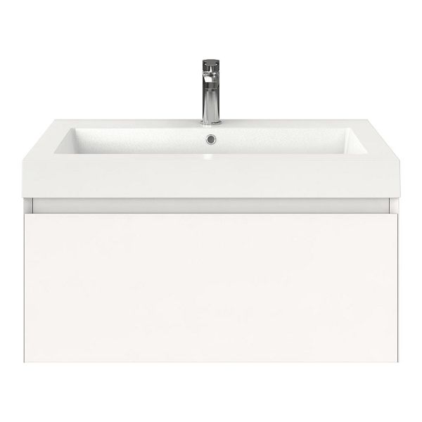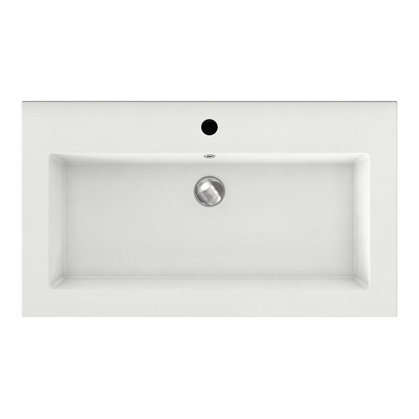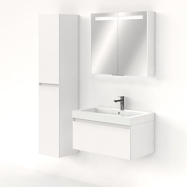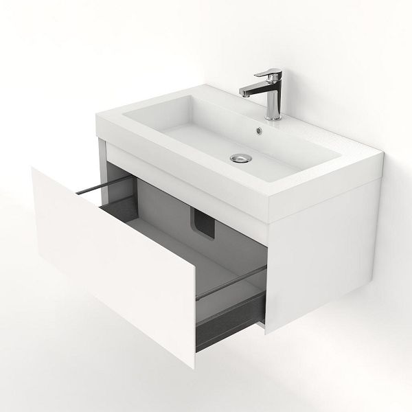 Greeploos badkamermeubel in de kleur wit mat is 80 cm breed. De wastafel is vervaardig in polystone en heeft de kleur wit. Dit badkamermeubel met deze wastafel is leverbaar tussen de 60 cm t/m 160 cm