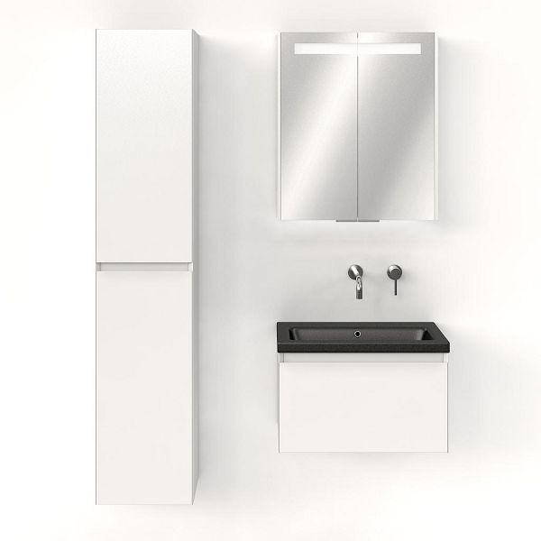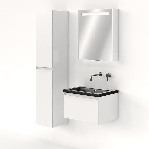 Greeploos badkamermeubel in de kleur wit hoogglans is 60 cm breed. De wastafel is vervaardig in keramiek en heeft de kleur zwart mat keramiek. Dit badkamermeubel met deze wastafel is leverbaar tussen de 60 cm t/m 140 cm