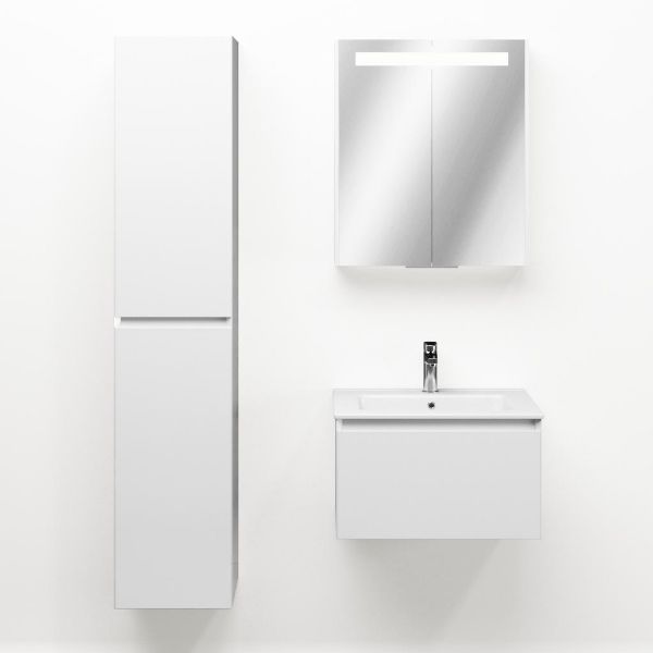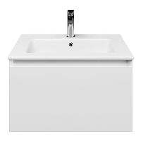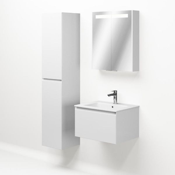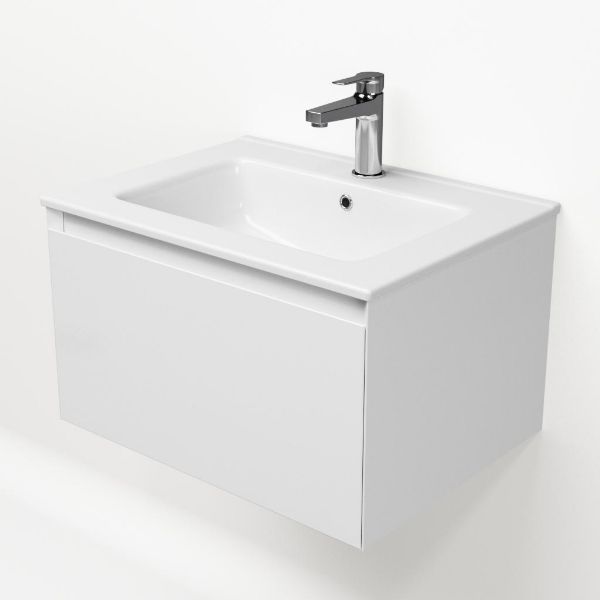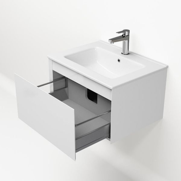 Greeploos badkamermeubel in de kleur wit hoogglans is 60 cm breed. De wastafel is vervaardig in keramiek en heeft de kleur wit keramiek. Dit badkamermeubel met deze wastafel is leverbaar tussen de 60 cm t/m 120 cm