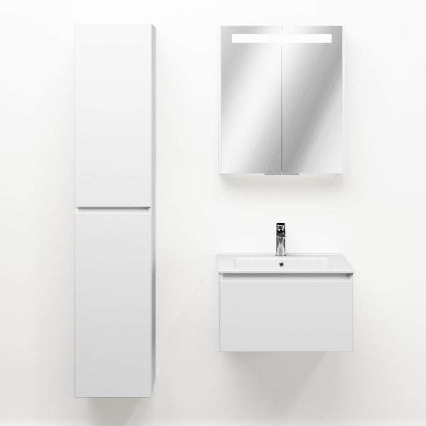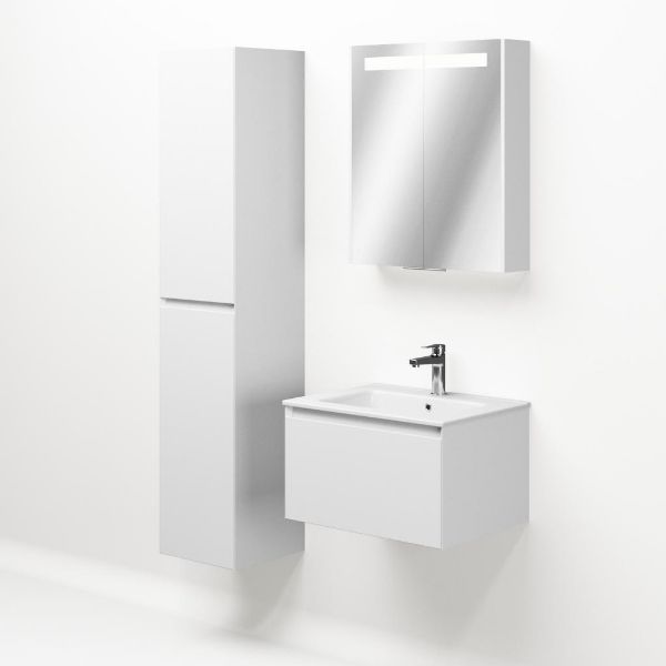Greeploos badkamermeubel in de kleur wit mat is 60 cm breed. De wastafel is vervaardig in keramiek en heeft de kleur wit keramiek. Dit badkamermeubel met deze wastafel is leverbaar tussen de 60 cm t/m 120 cm