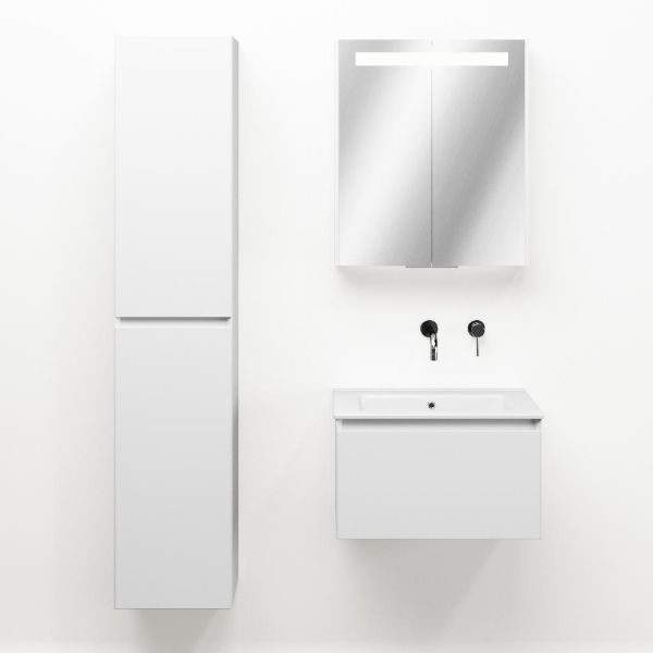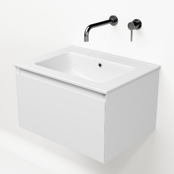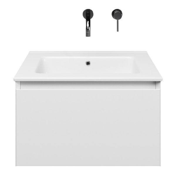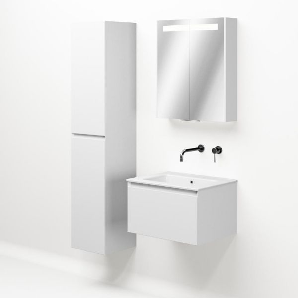 Greeploos badkamermeubel in de kleur wit mat is 60 cm breed. De wastafel is vervaardig in keramiek en heeft de kleur wit keramiek. Dit badkamermeubel met deze wastafel is leverbaar tussen de 60 cm t/m 120 cm