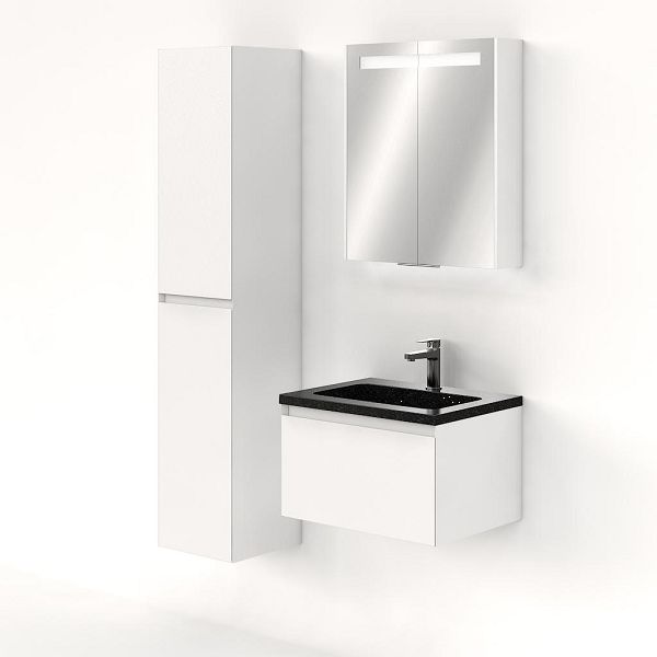 Greeploos badkamermeubel in de kleur wit mat is 60 cm breed. De wastafel is vervaardig in natuursteen en heeft de kleur shanxi black. Dit badkamermeubel met deze wastafel is leverbaar tussen de 60 cm t/m 120 cm