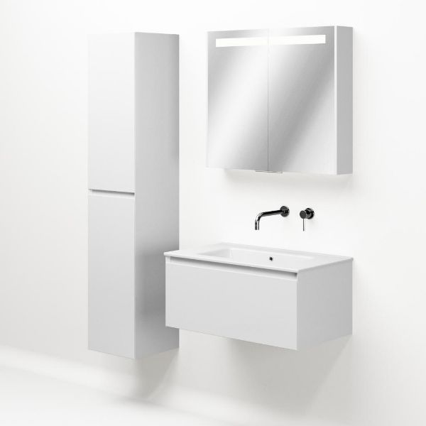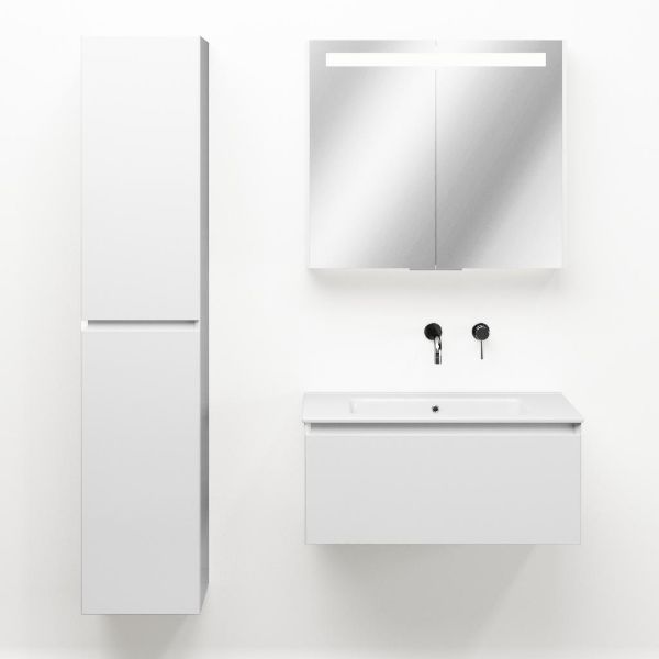 Greeploos badkamermeubel in de kleur wit hoogglans is 80 cm breed. De wastafel is vervaardig in keramiek en heeft de kleur wit keramiek. Dit badkamermeubel met deze wastafel is leverbaar tussen de 60 cm t/m 120 cm