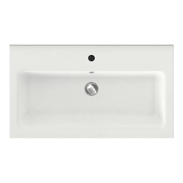 Greeploos badkamermeubel in de kleur wit mat is 80 cm breed. De wastafel is vervaardig in keramiek en heeft de kleur wit mat keramiek. Dit badkamermeubel met deze wastafel is leverbaar tussen de 60 cm t/m 140 cm