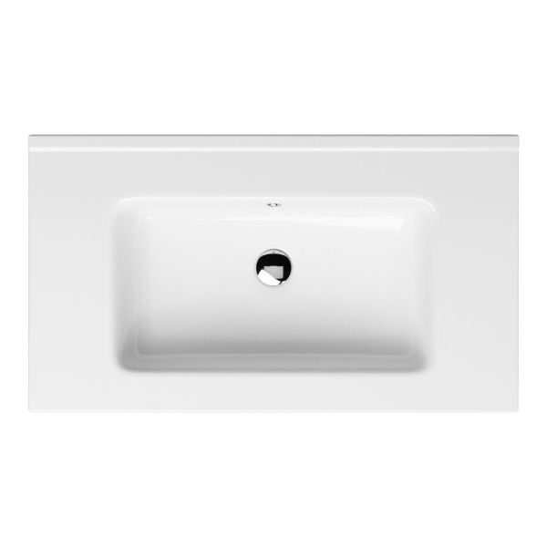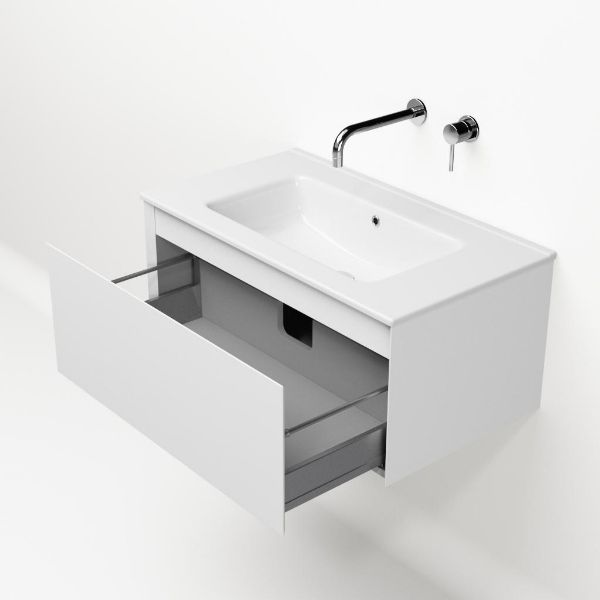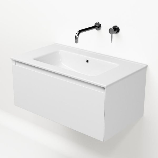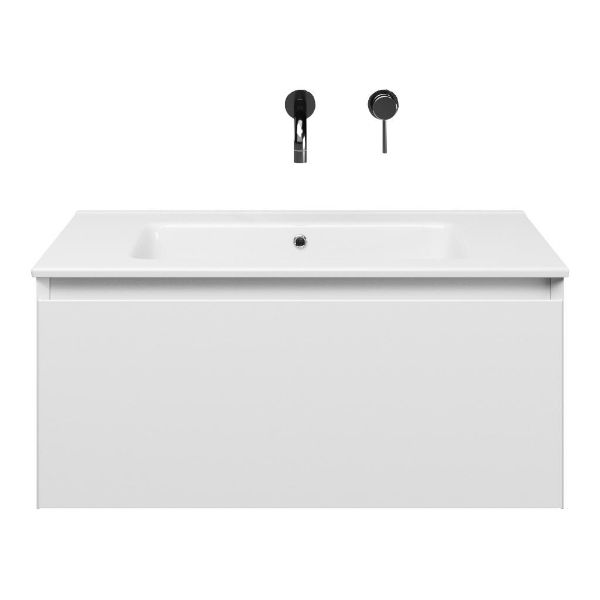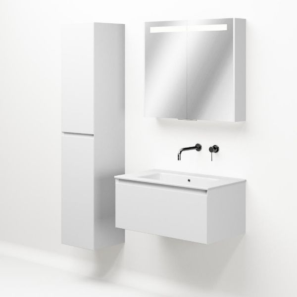 Greeploos badkamermeubel in de kleur wit mat is 80 cm breed. De wastafel is vervaardig in keramiek en heeft de kleur wit keramiek. Dit badkamermeubel met deze wastafel is leverbaar tussen de 60 cm t/m 120 cm