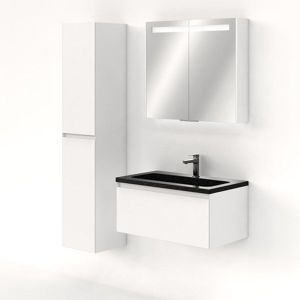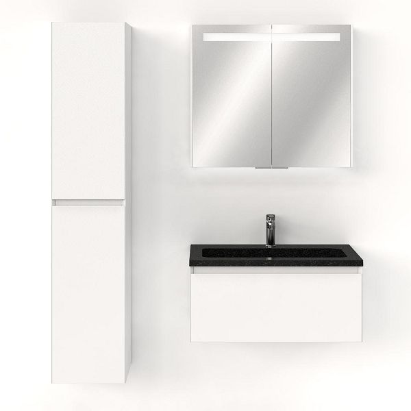 Greeploos badkamermeubel in de kleur wit mat is 80 cm breed. De wastafel is vervaardig in natuursteen en heeft de kleur shanxi black. Dit badkamermeubel met deze wastafel is leverbaar tussen de 60 cm t/m 120 cm