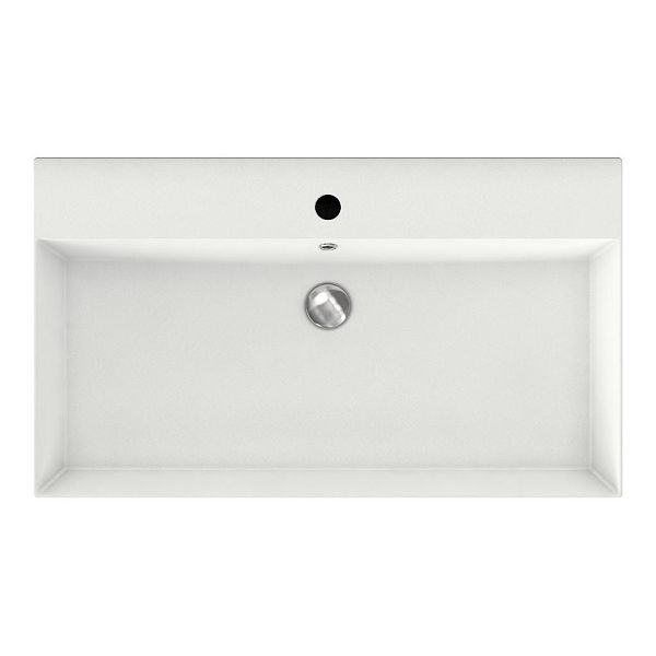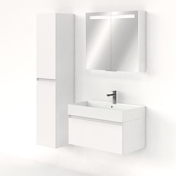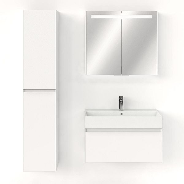 Greeploos badkamermeubel in de kleur wit mat is 80 cm breed.  De wastafel is vervaardig in keramiek en heeft de kleur wit mat keramiek. Dit badkamermeubel met deze wastafel is leverbaar tussen de 60 cm t/m 160 cm