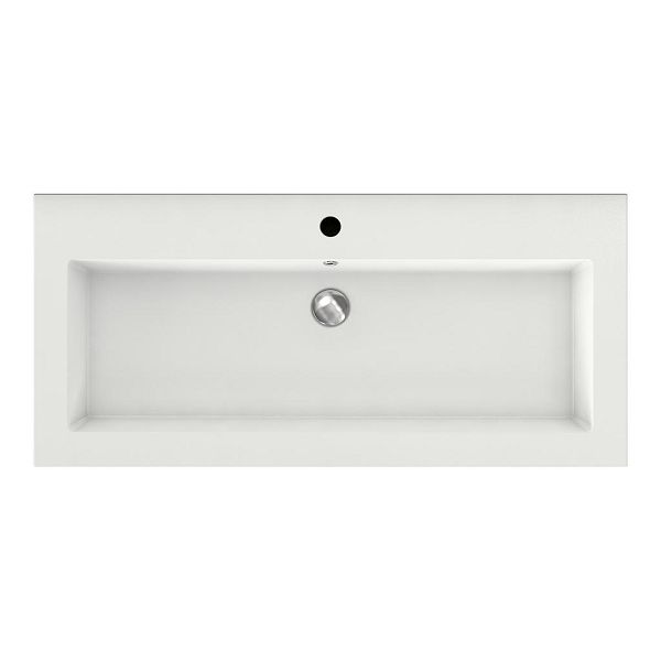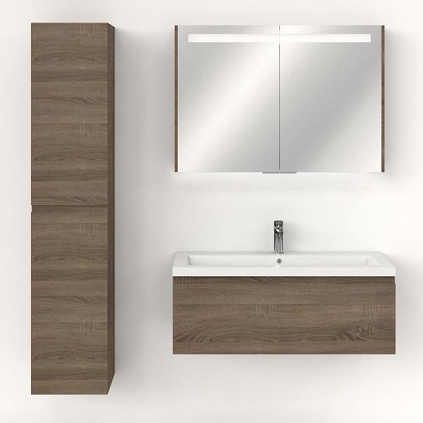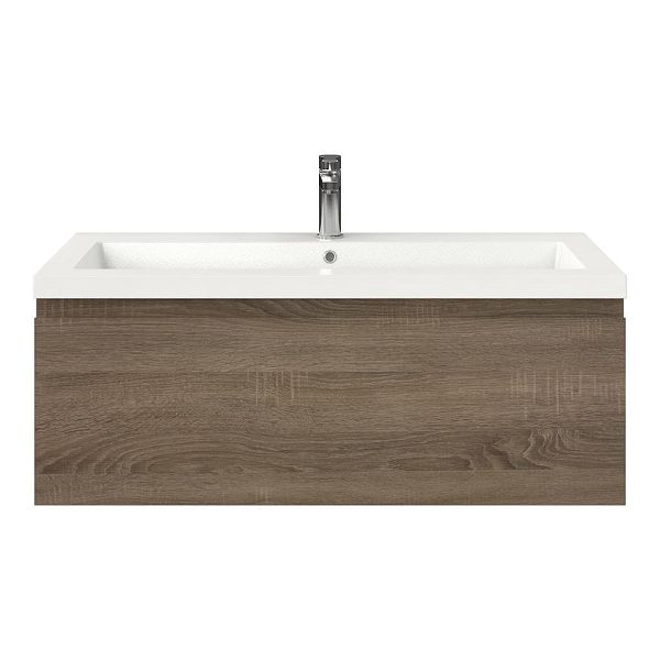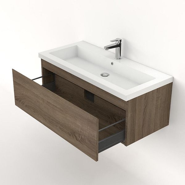 Greeploos badkamermeubel in de kleur eiken donker is 100 cm breed. De wastafel is vervaardig in polystone en heeft de kleur wit. Dit badkamermeubel met deze wastafel is leverbaar tussen de 60 cm t/m 160 cm