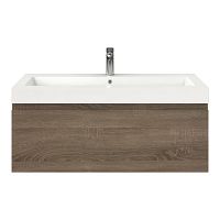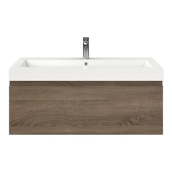 Greeploos badkamermeubel in de kleur eiken donker is 100 cm breed. De wastafel is vervaardig in polystone en heeft de kleur wit. Dit badkamermeubel met deze wastafel is leverbaar tussen de 60 cm t/m 160 cm