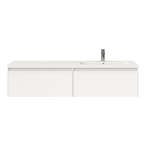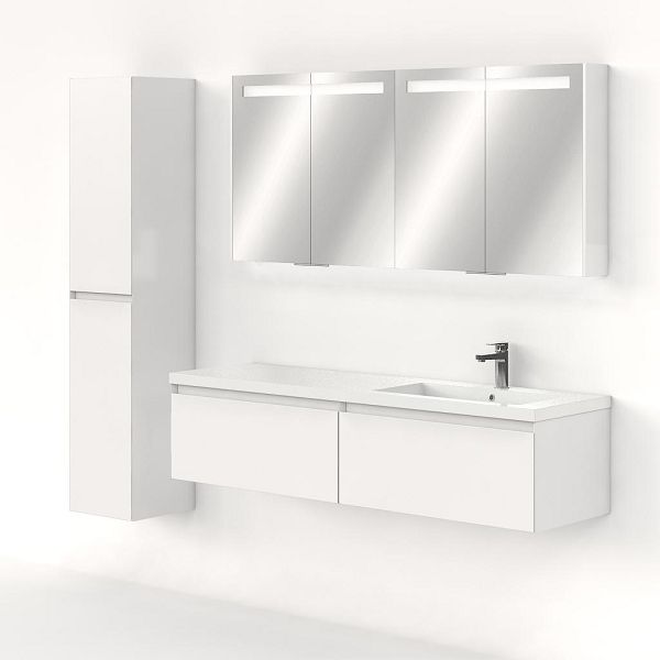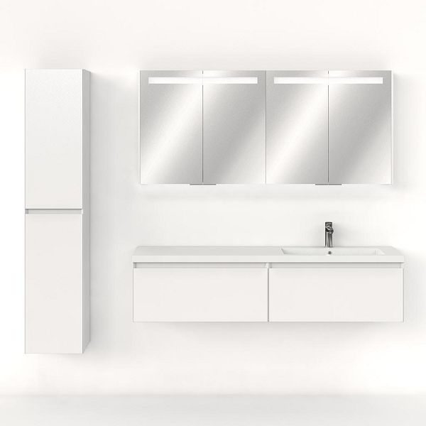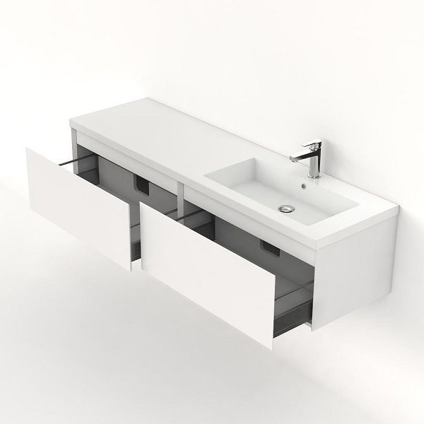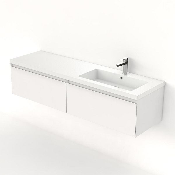 Greeploos badkamermeubel in de kleur wit hoogglans is 160 cm breed. De wastafel is vervaardig in polystone en heeft de kleur wit. Dit badkamermeubel met deze wastafel is leverbaar tussen de 60 cm t/m 160 cm