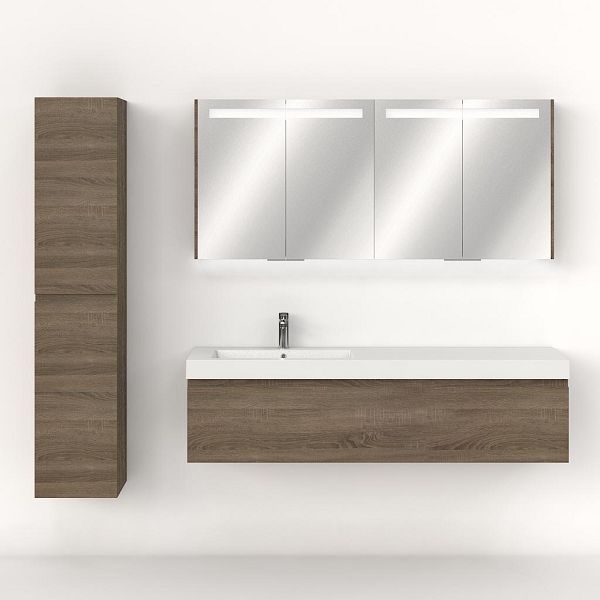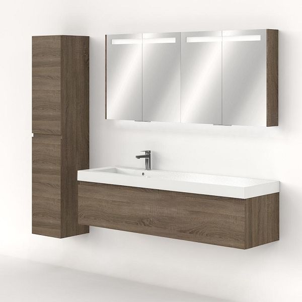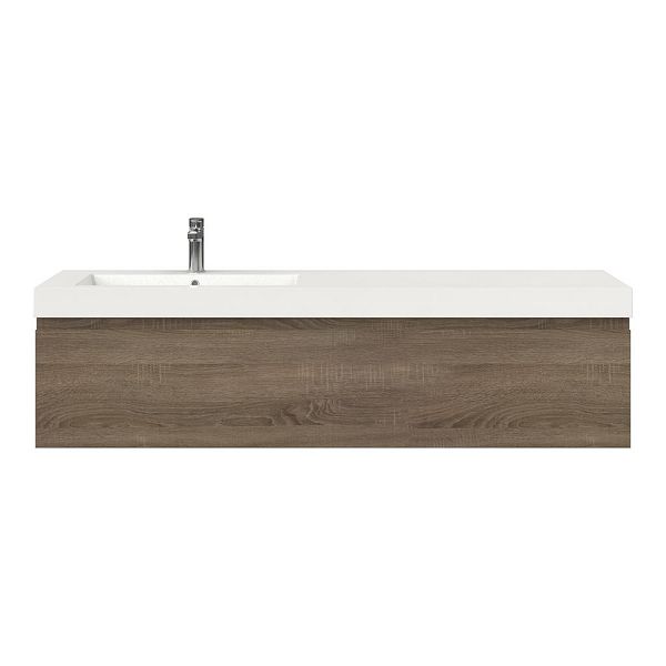 Greeploos badkamermeubel in de kleur eiken donker is 160 cm breed. De wastafel is vervaardig in polystone en heeft de kleur wit. Dit badkamermeubel met deze wastafel is leverbaar tussen de 60 cm t/m 160 cm