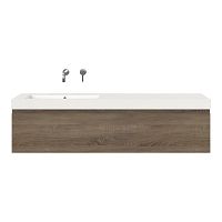 Greeploos badkamermeubel in de kleur eiken donker is 160 cm breed.  De wastafel is vervaardig in polystone en heeft de kleur wit. Dit badkamermeubel met deze wastafel is leverbaar tussen de 60 cm t/m 160 cm