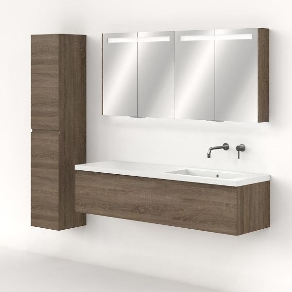 Greeploos badkamermeubel in de kleur eiken donker is 160 cm breed. De wastafel is vervaardig in polystone en heeft de kleur wit. Dit badkamermeubel met deze wastafel is leverbaar tussen de 60 cm t/m 160 cm
