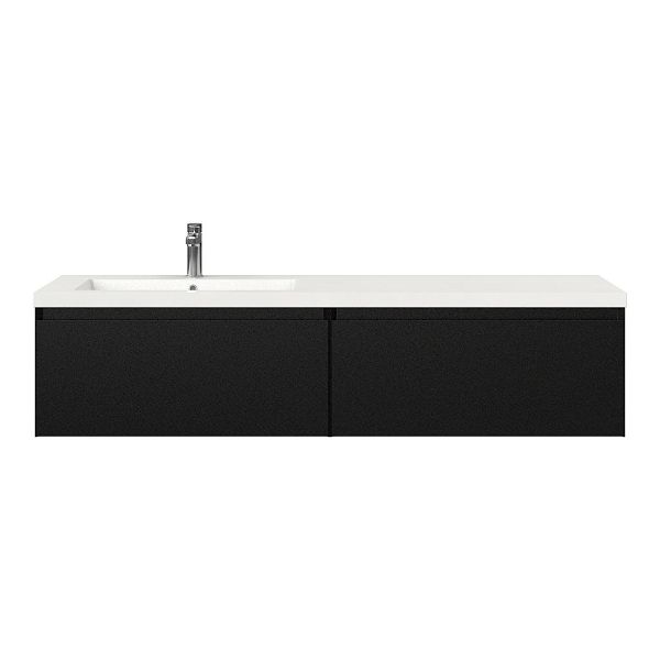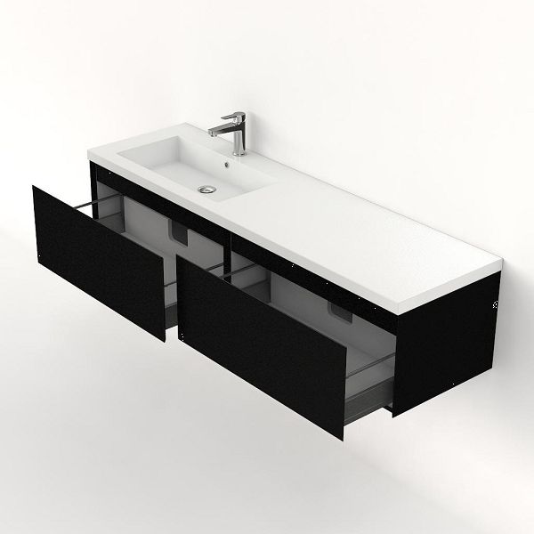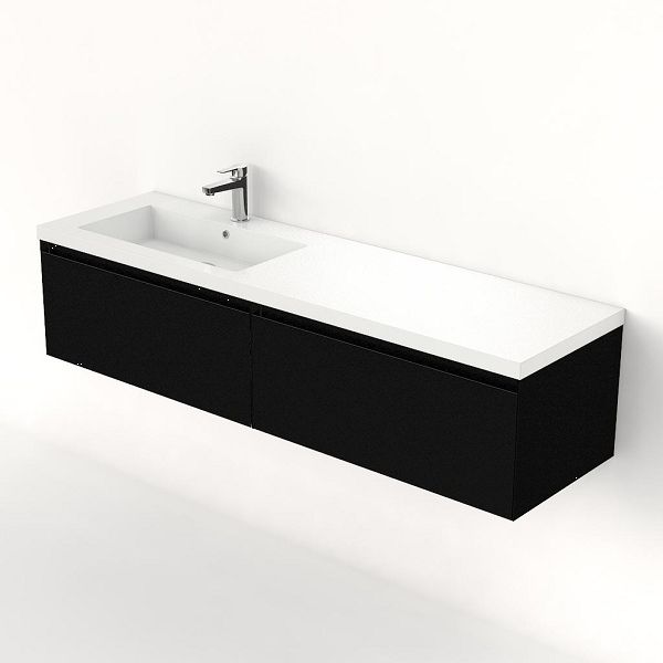Greeploos badkamermeubel in de kleur zwart mat is 160 cm breed. De wastafel is vervaardig in polystone en heeft de kleur wit. Dit badkamermeubel met deze wastafel is leverbaar tussen de 60 cm t/m 160 cm
