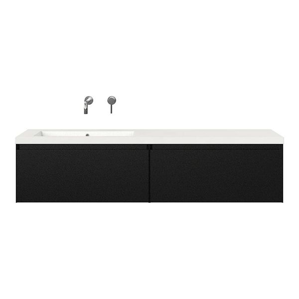 Greeploos badkamermeubel in de kleur zwart mat is 160 cm breed.  De wastafel is vervaardig in polystone en heeft de kleur wit. Dit badkamermeubel met deze wastafel is leverbaar tussen de 60 cm t/m 160 cm