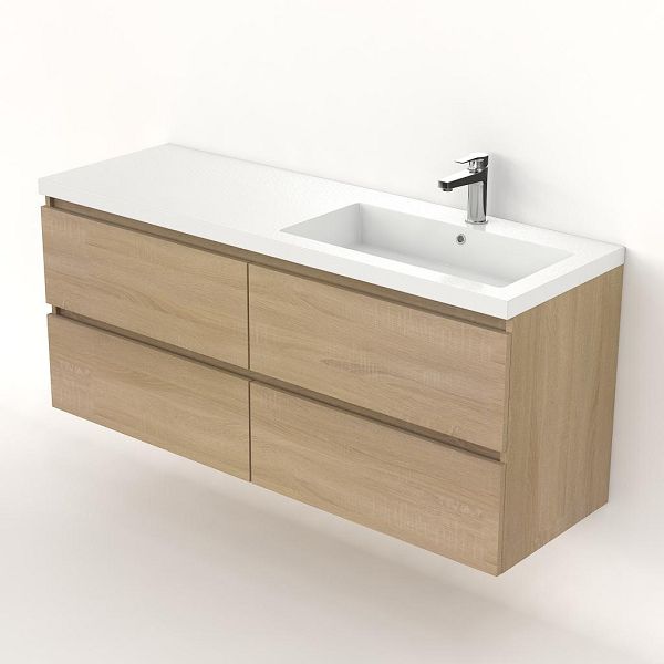 Greeploos badkamermeubel in de kleur eiken licht is 140 cm breed.  De wastafel is vervaardig in polystone en heeft de kleur wit. Dit badkamermeubel met deze wastafel is leverbaar tussen de 60 cm t/m 200 cm