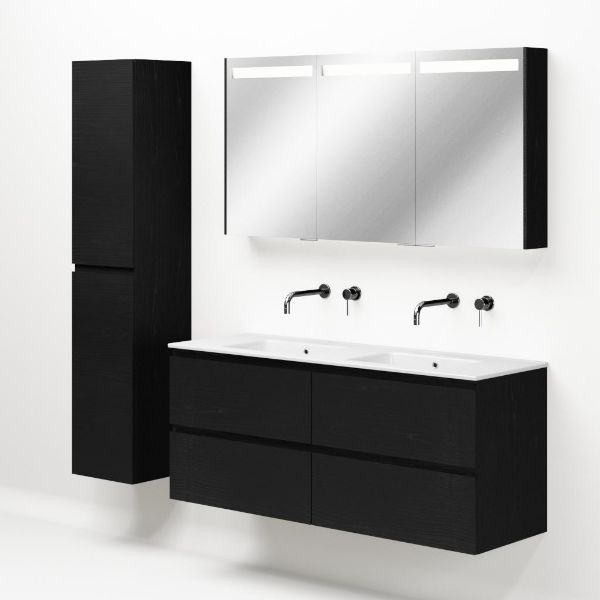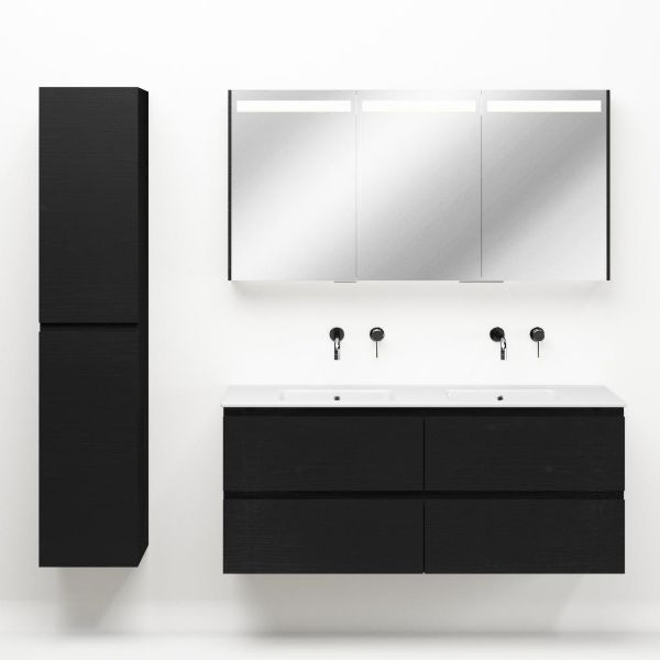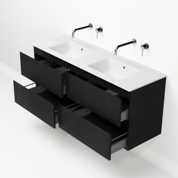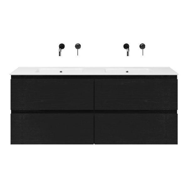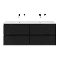 | | Bellanti Gisella/Etna badmeubel 140x46 4 softclose laden zwart mat eiken greeploos keramische wastafel dubbel wit zonder kraangat |