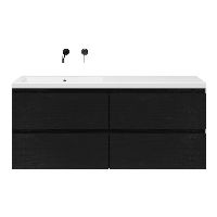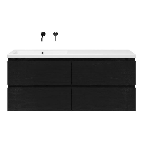 Greeploos badkamermeubel in de kleur zwart mat eiken is 140 cm breed.  De wastafel is vervaardig in polystone en heeft de kleur wit. Dit badkamermeubel met deze wastafel is leverbaar tussen de 60 cm t/m 200 cm