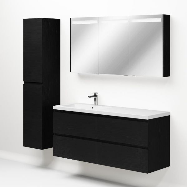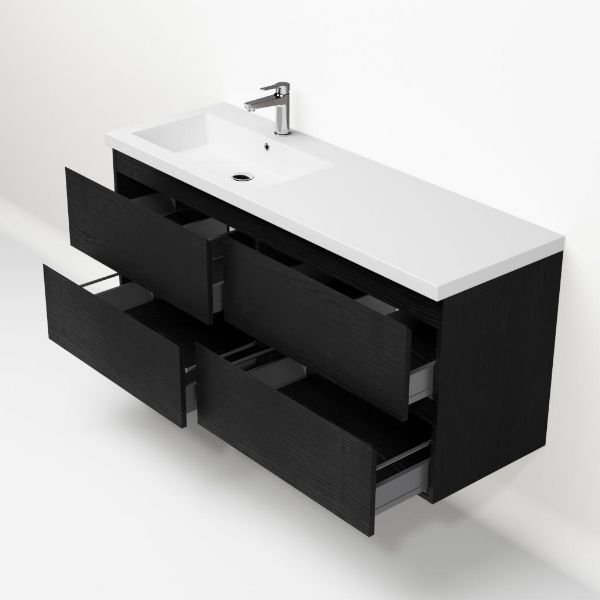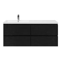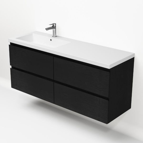 Greeploos badkamermeubel in de kleur zwart mat eiken is 140 cm breed. De wastafel is vervaardig in polystone en heeft de kleur wit. Dit badkamermeubel met deze wastafel is leverbaar tussen de 60 cm t/m 200 cm