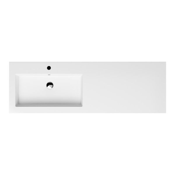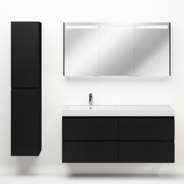 Greeploos badkamermeubel in de kleur zwart mat eiken is 140 cm breed.  De wastafel is vervaardig in polystone en heeft de kleur wit. Dit badkamermeubel met deze wastafel is leverbaar tussen de 60 cm t/m 200 cm